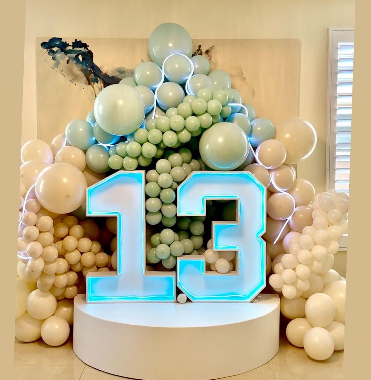 props, artificial green wall, florals walls, Letters and numbers marquees.